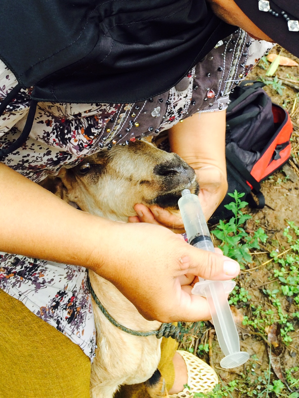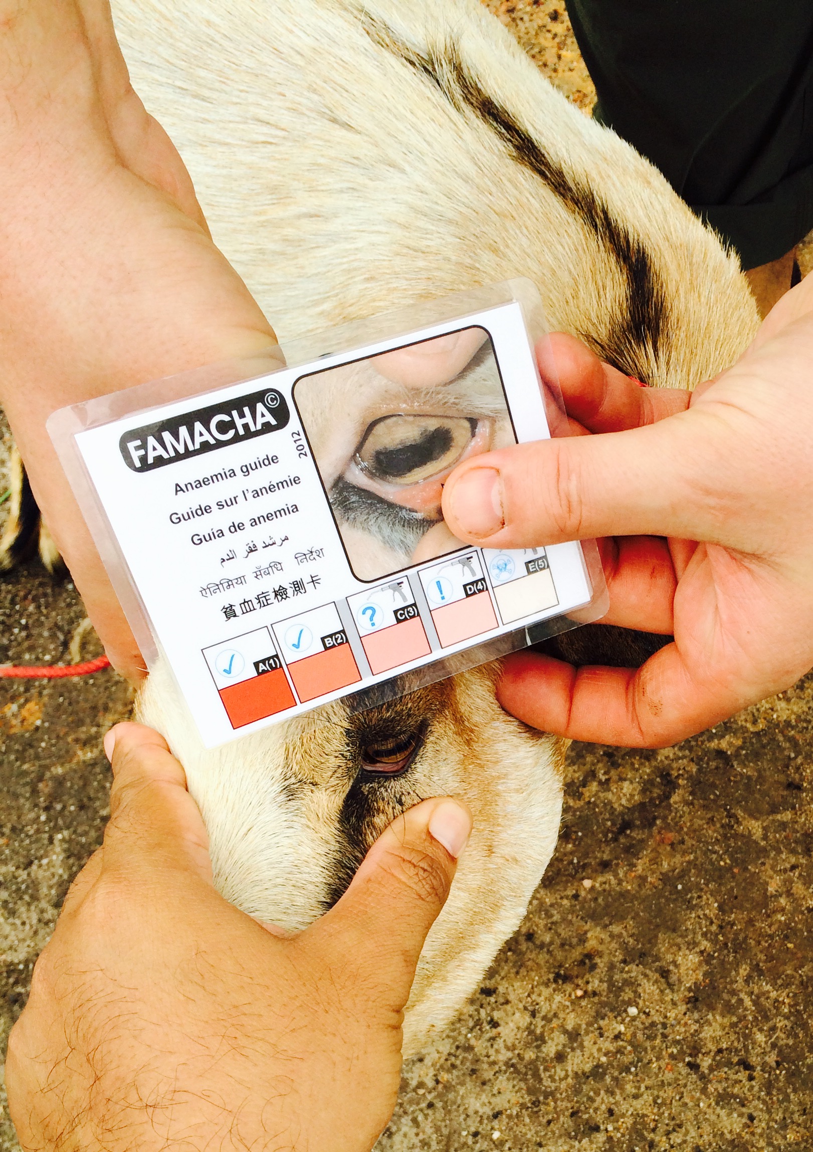 Highly reproductive goats (especially healthy twin kids) underscore the benefit of enhancing animal health & husbandry. Training has expanded formally with use of the FAMACHA card. Pinker color to conjunctival mucous membranes under lower eyelid indicates anemia is not a health concern. New training in selectively administering oral de-wormer may decrease parasite loads in overall herd of approximately 250 goats.