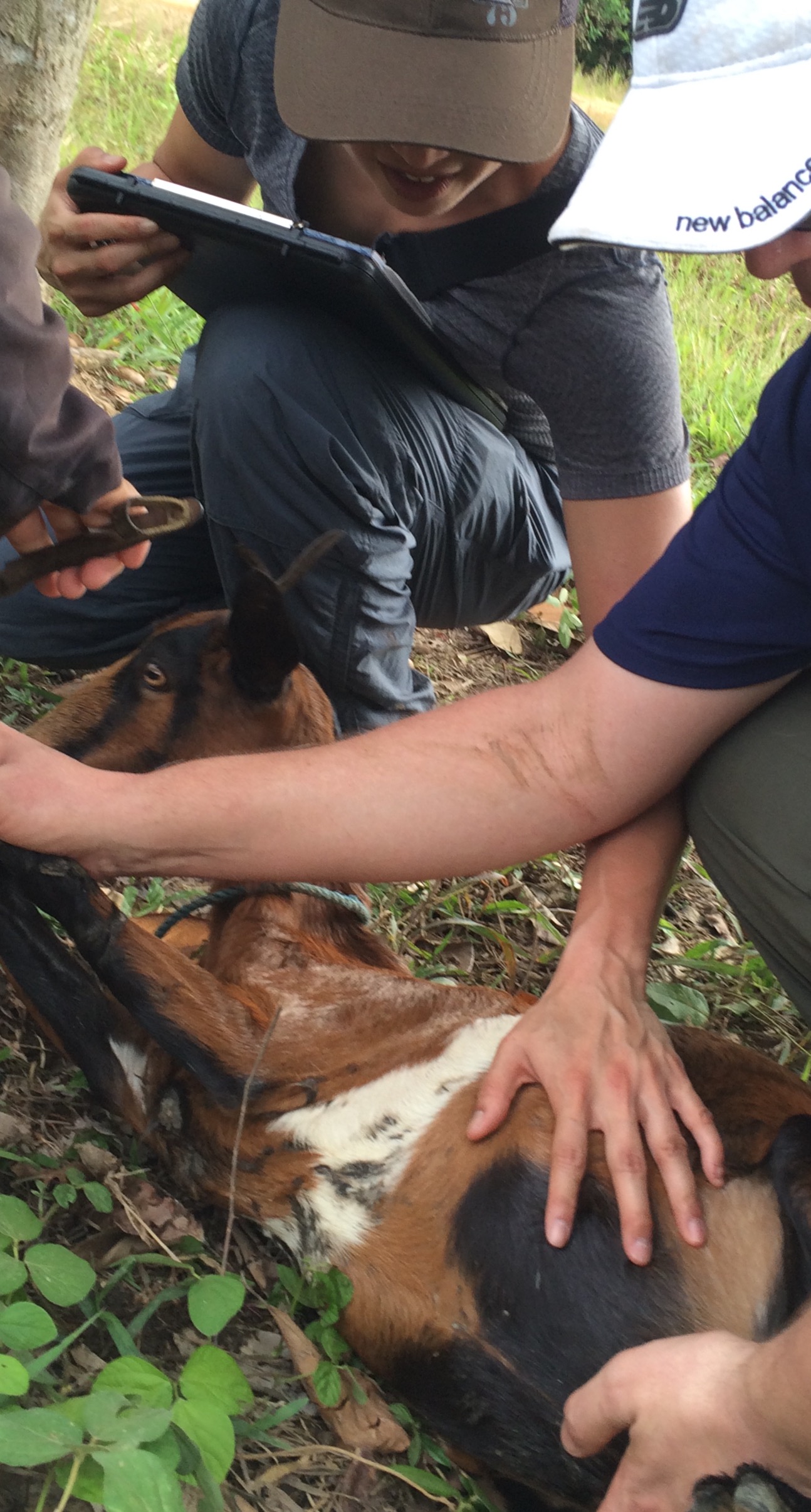 Andrew Winterborn, D.V.M., and Valerie Lou, M.D., examining a pregnant goat.